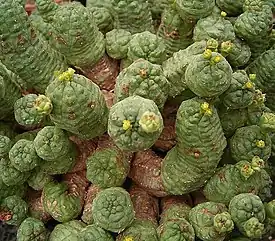 Медленно растущий суккулентный карликовый кустарник, похожий на кактус, без колючек. Формирует коврик до 20 см в диаметре.