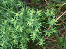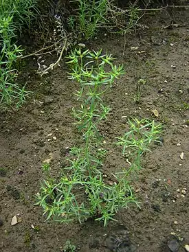 Стебли благодаря ветвящемуся основанию чаще в числе нескольких или многочисленные, прямостоячие, приподнимающиеся или лежачие, тонкие, круглые, жёлто-зелёные, иногда красноватые, густо олиственные, большей частью ветвистые, наверху большей частью с 1—5 пазушными цветоносами (0,3—4 см длиной), а ниже часто с многочисленными, более-менее развитыми олиственными ветвями.