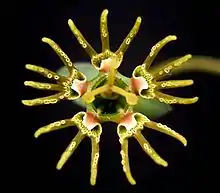 Циатии звездчатые, зеленовато-жёлтые, на длинных, тонких, нитевидных цветоносах 3—8 см длиной, по 1—2 собраны в соцветия, длинно- или коротко-черешчатые. Листочки обёртки в числе 4—5, бокальчик 2 см в диаметре с ромбическими лепестками. Нектарники в числе 5, разделены на 3—4 линейных сегмента 7 мм длиной, с маленькими окаймлёнными белым впадинами.