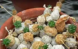 Тёмный суккулентный карликовый полукустарник без шипов, высотой до 8 см, ветви которого, идущие от основания, составлены из причудливых шаровидных сегментов. Формирует густые подушки до 30 см в диаметре.