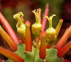 Сильно ветвящийся от основания суккулентный двудомный кустарник до 30—100 см высотой, густо покрытый толстыми, красивыми, хорошо заметными, длинными, красными шипами.