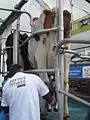 Наиболее эффективная с точки зрения трудозатрат и качества молока организация процесса доения предусматривает построение специализированных доильных залов с подачей молока в централизованный молокопровод. Существует несколько типов доильных установок для доильных залов; в установках типа «тандем», «ёлочка», «параллель» коровы доятся в индивидуальных станках, расположенных по обе стороны траншеи, в которых работает оператор и устанавливает доильные аппараты, в первой системе станки расположены параллельно траншее, во второй — под углом 30° или 60°, в третьей — перпендикулярно траншее (используется поворотная калитка, разворачивающая животных выменем к оператору). В крупных хозяйствах широко используются карусельные доильные системы, в которых животные размещаются на круглой вращающейся платформе, оператор, в зависимости от конструкции, может находиться во внутреннем радиусе или снаружи платформы. Карусельная система изобретена в США в 1930-е годы, но распространение в Западной Европе, Австралии и Новой Зеландии получила лишь с 1960-х годов[22], в начале 1980-х годов карусельная система появилась и в СССР — была установлена на одном из крупнейших в мире молочных хозяйств того времени «Щапово»[23].