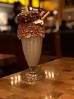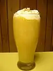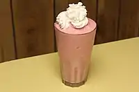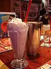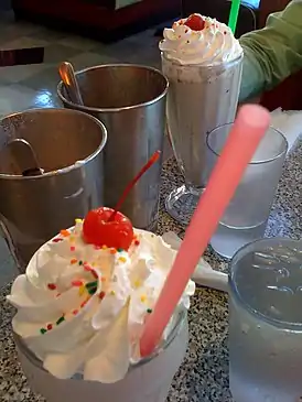 ![]() Молочные коктейли, украшенные взбитыми сливками и коктейльными вишнями. Слева находятся стаканы от миксера для молочных коктейлей. | |