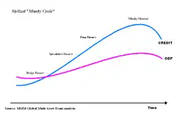 Цикл начинается с низшей точки, в которой экономика оказалась в результате предыдущего цикла. После того, как экономика оказалась на дне, начинается длительный период экономического роста и оживления активности на финансовых рынках. В этот период инвесторы относятся к перспективам роста настороженно, так как помнят о последствиях сверхоптимизма, который привёл к предыдущему кризису. Доминируют консервативно настроенные инвесторы. По мере роста экономики растут цены на финансовые активы. Последствия предыдущего кризиса забываются и начинают преобладать оптимистичные спекулятивные настроения. Инвесторы активно используют финансовый рычаг, в результате чего накапливаются долги, а цены на активы отрываются от реальных темпов роста экономики. В точке наивысшего подъёма рынка наступает момент Мински, когда инвесторы осознают, что долги невозможно вернуть, а активы сильно переоценены. Попытка вернуть долги ведёт к волне распродаж и обвалу рынка. В результате всё заканчивается финансовым и экономическим кризисом.