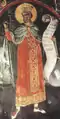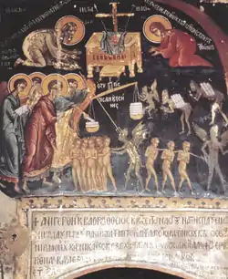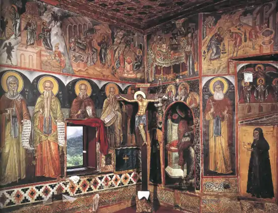 Под сводом храма находится Платитера Влахернити. В полукруге — священнослужители — Великий Василий и Иоанн Креститель. С восточной стороны, рядом со сводом, Иаков и пророк Исаия. Ниже первомученик архидиакон Стефан. На вершине храма — Молитва с Христом. В нижнем поясе восточной стены — пророк Иона в чреве кита. Под аркой изображены Воскресение Христово, Снятие с Креста, Пятидесятница, Рождество Христово.