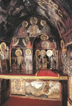 Божественный круг продолжается и в основном храме, правда здесь он обогащён сценами страданий. Под сводом восточной башни расположены — Рождество, Сретение, Распятие и Снятие с Креста. Ниже, справа и слева от святилища, святые Николай и Иоанн Предтеча. В центре купола Благовещение, справа и слева по три мученика.