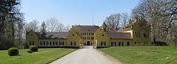 В начале 1946 года для мюнхенских иноков было приобретено полуразрушенное двухэтажное здание бывшей школы гитлерюгенда (1939)[2] рядом с замком Блютенбург[4]. В журнале «Православная Русь» за 1947 год приводится такое свидетельство: «Когда мы въехали, во всем доме нашли только две широкие скамьи из раздевалки душа. Эти скамьи долгое время служили кроватями для двух братьев — остальные спали на полу… Деревянные кровати дали нам по знакомству американские учреждения <…>, но шкафов до сих пор не приобрели — их негде достать»[5].
