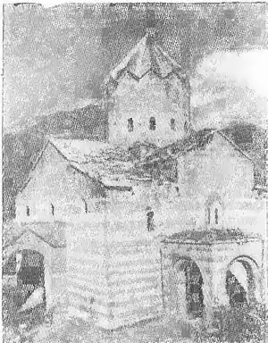 Монастырский комплекс состоял из храма, колокольни, стены и подсобных построек. Церковь монастыря, вероятно, была повреждена землетрясением 1679 года, и в 1694 году была построена заново из полированного базальта и красноватого фельзита, с семигранной скинией внутри и куполообразной базиликой с четырьмя крестами.[1][2][3]