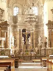 Главный, полукруглый алтарь центрального нефа декорирован коринфскими колонами и пилястрами, рядом с которыми размещены круглые скульптуры и четыре медальона с головами львов. Венчают аттик алтаря 5 скульптур, полных барочной экспрессии. Центральная скульптура аттика, наиболее крупная в верхнем ярусе алтаря, представляет Бога Отца.