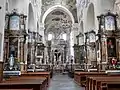Интерьер датирован XVII—XVIII веками. В его оформлении выделяется обилие скульптуры и живописи. Стиль алтарей представляет собой переход от барокко к классицизму. Их художественное решение отличает, с одной стороны — чёткость и строгость классицизма, с другой — ощутимое желание создать более экспрессивные, текучие формы, при помощи дуговых завершений верхнего яруса и несколько хаотичных гирлянд в духе барокко. Эффектно смотрятся рельефные стукковые панно, которые выступают доминантами верхних ярусов всех алтарей, кроме главного.