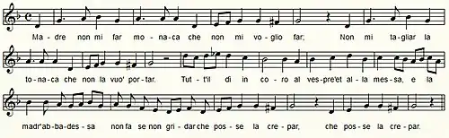 | Madre non mi far monaca che non mi voglio far; Non mi tagliar la tonaca che non la vuo' portar. Tutt'il dì in coro al vespre'et alla messa, e la madr'abbadessa non fa se non gridar che posse la crepar[9]. |