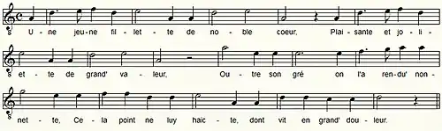| Une jeune fillette De noble coeur, Plaisante et joliette De grand' valeur, Outre son gré on l'a rendu' nonnette, Cela point ne luy haicte, Dont vit en grand' douleur[10]. |