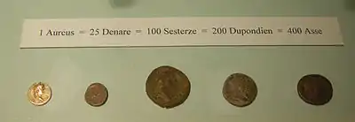1 ауреус = 25 денариям = 100 сестерциям = 200 дупондиям = 400 ассам.