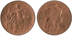 | 1898 - 1921 | 5 сантимов | 25 мм | 5 г | гладкий | бронза | 211 630 899 | III-я республика |