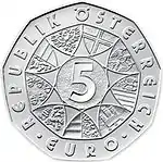Аверс: 9-сторонняя звезда, символизирующая 9 федеральных земель Австрии, в центре которой находится номинал монеты «5» с надписями нем. Republik Österreich (рус. Республика Австрия) и «евро».