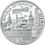 Аверс: Статуя дракона Линдворма и фонтана, посвящённого ему. Надпись в верхней части монеты надпись: нем. Republik Österreich (рус. Республика Австрия). Внизу стоит номинал монеты «10 Euro». В верхней части монеты выгравирована надпись: нем. Lindwurm brunnen (рус. Фонтан Дракона). |