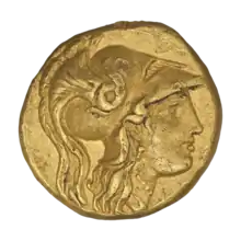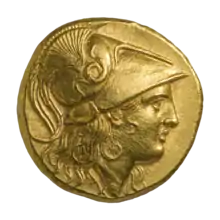 - Золотой статер Александра III Великого. На аверсе — голова богини Афины в Коринфском шлеме и змея, свернувшаяся колечком. Волосы Афины — свободно спадающие локоны, на шее — бусы. На реверсе: изображение богини победы Ники влево. В правой руке ее венок, в левой длинный стилус. Справа от Ники вертикально легенда: «Александр»[5].