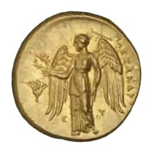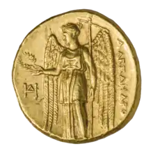 - Золотой статер Александра III Великого. На аверсе изображена голова Александра Македонского с рогами бога Аммона вправо. На реверсе — богиня Афина Никефорос, которая сидит на троне. Ее правая рука вытянута, она держит статуэтку Пики, левая рука опирается на щит[5].