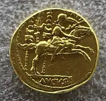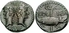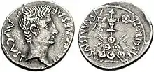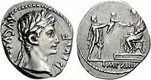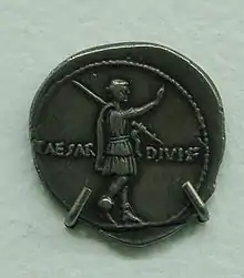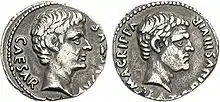 В 42 г. до н. э. Гай Юлий Цезарь был обожествлён. Это превратило молодого Октавиана в «divi filio» («сына божественного»). Подавляющее большинство монет Октавиана в доимперский период содержат указания на его связь с «божественным» отцом. На ауреусах и денариях помещали различные вариации его титула «IMP CAESAR DIVI FILIO», обозначавшего «Император Цезарь сын божественного»[24][25]. Одновременно выпускали монеты с изображениями Юлия Цезаря и Октавиана, располагавшихся либо вместе, либо на разных их сторонах[23].
