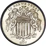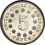 - Shield Nickel 1866 - 1883 (англ.). Сайт www.coincommunity.com. — Тираж 5-центовой монеты 1866—1883 по годам. Дата обращения: 12 сентября 2010. Архивировано 20 августа 2011 года.