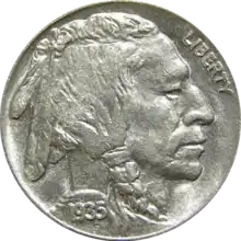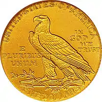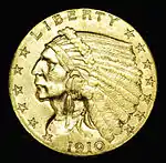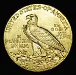 При этом монеты номиналом в 2,5 $ и 5 $, разработанные бостонским скульптором Бела Праттом, отличались от всех своих предшественниц тем, что элементы изображения на них были не выпуклыми, а тиснёными. Это имело как положительные, так и отрицательные стороны. К «плюсам» можно отнести то, что тиснёное изображение практически не стиралось во время обращения монеты, в отличие от выпуклого. Монета могла находиться в обращении значительно больше времени. Главным «минусом» стало накапливание грязи в элементах изображения. Она лишала монету эстетической привлекательности и могла быть источником передачи инфекционных заболеваний[32]. Монеты в 2,5 и 5 долларов с изображением индейца являются единственными монетами США, изображение которых не выпуклое, а вдавленное.