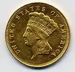 С 1853 года стали чеканить 3-долларовые монеты. Предпосылкой их создания стало снижение цены на почтовые марки до 3 центов. Одним из сенаторов было предложено начать чеканить серебряные монеты номиналом в 3 цента и золотые 3 доллара, за которые можно было бы приобрести 1 марку или лист из 100 марок, соответственно. Монетным актом от 21 февраля 1853 года было разрешено выпускать 3-долларовые золотые монеты[24].