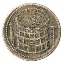 В 80 году был официально освящён новый колоссальный амфитеатр Флавиев — Колизей, изображение которого сразу же поместили на монеты[к 11]. Данные нумизматики позволяют воспроизвести его первоначальный облик, когда костяк здания не был обнажён, а второй и третий этажи украшали статуи. Слева от здания находился обелиск, а справа — часть портиков в два яруса[44]. Обелиск, для украшения архитектурного ансамбля вывезенный из Египта, поместили на несколько монетных типов. У его основания на монетах гирлянда, кверху он сужается. На вершине изобразили двуликого бога Януса, из обоих ртов которого вытекают струи воды[к 12][45].