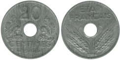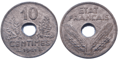 | 1942 — 1944 | Алюминий | 0,8 г | 18 мм | рубчатый | Номинал, девиз государства, год чеканки | эмблема Вишистского правительства — средневековый топорик — франциска | Всего выпущено: — 129 758 321 шт. |