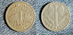 В годы Второй мировой войны вишистская Франция выпускала собственные франки, привязанные к немецкой рейхсмарке. Были выпущены монеты достоинством 10, 20, 50 сантимов и 1, 2, 5 франков. На реверсе новых монет номиналом от 50 сантимов до 5 франков, выпущенных в 1942—1944 годах, был изображён герб Вишистского правительства средневековый двусторонний топорик-франциска — лабрис. Также на монетах присутствовали такие элементы, как колосья пшеницы (пучок собранных воедино колосьев являлся символом фашизма). На аверсе этих монет девиз Французской республики «Свобода, равенство, братство» был заменён на «Travail, Famille, Patrie» («Труд, Семья, Отечество»).