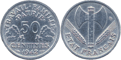 | 50 сантимов 1942. Дизайнер Люсьен Базо | ||||||||||||