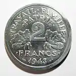 | 1943 — 1944 | Алюминий | 2 г | 27 мм | рубчатый | Номинал, девиз государства, год чеканки | герб Вишистского правительства средневековый топорик — франциска | Всего выпущено: — 211 242 226 шт. |