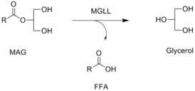 ![]() Реакция, катализируемая МГЛ, в которой свободная жирная кислота высвобождается из моноацилглицерина (МАГ) | |