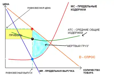 Монополистические конкуренты не обладают значительной монопольной властью, поэтому динамика спроса будет отличаться от спроса монополии. За счет того, что на рынке существует конкуренция, в случае повышения цены на продукцию первой фирмы потребители будут обращаться к другой, поэтому спрос на продукцию каждой из фирм будет эластичным. Уровень эластичности будет зависеть от степени дифференциации, которая является фактором привязки к продукции каждой из фирм. Оптимальный объём производства каждой фирмы определяется аналогично случаю чистой монополии. Исходя из графика следует заметить, что цена определяется по кривой спроса. Наличие прибыли или убытков зависит от динамики средних издержек. Если кривая ATC проходит ниже Po, то фирма получает прибыль (заштрихованный прямоугольник). Если кривая ATC проходит выше, то это величина убытков. Если цена не превышает величину средних издержек, то фирма останавливает деятельность.