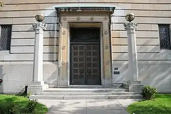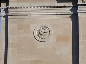 Фасады на улицах Шербрук и Св. Марка выполнены из куинстонского известняка. Основание главного фасада, выходящего на Шербрук, выполнено из рустованного известняка; в нём сделаны четыре окна и привлекающий внимание центральный вход в окружении двух стоящих колонн, увенчанных земной и небесной сферами. Главная дверь сделана из бронзы. Верхняя часть основания представляет собой пояс с орнаментальной резьбой и словами: FIDES, VERITAS, CARITAS, LIBERTAS, SPES, что означает на латыни: Вера, Правда, Милосердие, Свобода и Надежда.