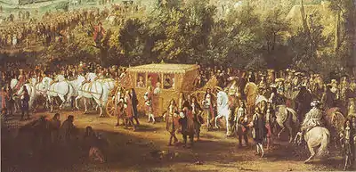 В карете находится мадам Монтеспан (блондинка в самой середине); кроме неё места в карете занимают Генриетта Стюарт, кузина короля Великая Мадемуазель, королева Мария Терезия, а также старшая сестра мадам Монтеспан, Габриела. Всадник в красной шляпе позади кареты — король Людовик XIV; его младший брат Филипп изображён в синем, правее короля.