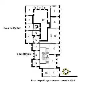 В 1685 году по причине того, что влияние маркизы де Монтеспан шло на убыль из-за приписываемого ей участия в «Деле о ядах», король присоединил занимаемые ею помещения к своим Малым апартаментам, а саму фаворитку переселил в Банный кабинет на втором этаже Дворца[8]. На месте её шикарной галереи Миньяр по заданию Людовика XIV обустроил галерею, предназначенную для размещения полотна «Моны Лизы»[9].