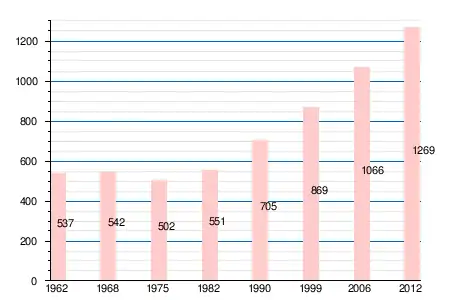 | 1962 | 1968 | 1975 | 1982 | 1990 | 1999 | 2005 | 2006 | 2010 | 2011 | 2012 |
