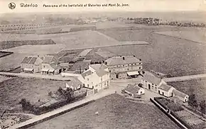 ![]() Вид с вершины Насыпи льва с видом на деревни Леон (на переднем плане) и Мон-Сен-Жан и его фермы (вдалеке справа) | |