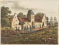 Фермерский дом Мон-Сен-Жан. Этот дом находился в тылу поля битвы, и был сильно повреждён случайным выстрелом. Гравюра Джеймса Роуза (1815)