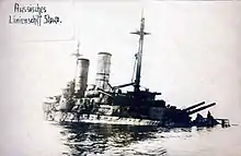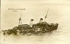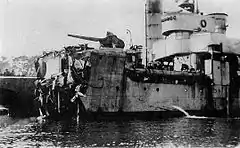 ![]() Лежащий на грунте броненосец «Слава», Моонзундский канал, конец 1917 года. | |||