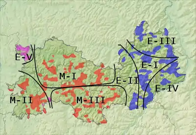 - переходный диалект (наречие) — распространён между западным и юго-восточным диалектами, имеет черты обоих.