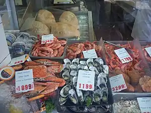 По большей части исламские диетические законы разрешают употребление в пищу морепродуктов, хотя ханбали запрещают угрей, шафи запрещают лягушек и крокодилов, а ханафи запрещают моллюсков и карпов.[95] Еврейские законы Кашрута запрещают употребление в пищу моллюсков и угрей.[96] В Ветхом Завете Моисеев Завет разрешал израильтянам есть рыбу, но моллюски и угри считались мерзостью и не допускались.[97] В древние и средневековые времена католическая церковь запрещала употребление в пищу мяса, яиц и молочных продуктов во время Великого поста. Фома Аквинский утверждал, что они «доставляют большее удовольствие как пища [чем рыба] и большее питание для человеческого тела, так что от их потребления получается больший излишек семенной материи, которая в избытке становится большим стимулом для похоти».[98] В Соединенных Штатах католическая практика воздержания от мяса по пятницам во время Великого поста популяризировала жарку рыбы вместо этого,[99] и приходы часто спонсируют жареную рыбу во время Великого поста[100] В преимущественно римско-католических районах рестораны могут корректировать свое меню во время Великого поста, добавляя в меню блюда из морепродуктов.[101]