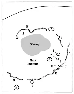 Обозначения соответствуют буквенным индексам на изображении справа. (A) Залив Радуги, (B) горы Юра, (C) Платон, (D) горы Альпы, (E) Аристилл, (F) Автолик, (G) Архимед, (H) Болото Гниения, (J) место посадки Аполлона-15, (K) горы Апеннины (L) Эратосфен, (M) горы Карпаты, (N) Коперник, (O) горы Кавказ.