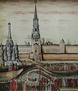 ![]() «Собравшийся народ присягает новоизбранному царю Михаилу Фёдоровичу» (иллюстрация из коронационного альбома Михаила Фёдоровича, 1673). В. П. Морозов стоит на Лобном месте, одетый в красный кафтан. | |