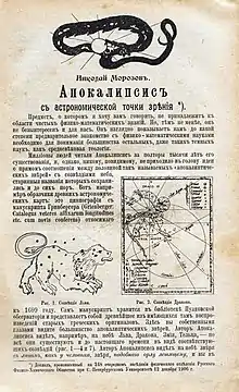 Весной 1907 года Морозов даже сумел получить командировку в Париж, где намеревался собирать материалы и прочитать лекции об истории создания Апокалипсиса. В декабре 1907 года, благодаря знакомству с князем Д. О. Бебутовым, Морозов был принят в масонскую ложу «Полярная звезда», в которой состоял, по крайней мере, до 1914 года. Через ложу он получил сведения о деятельности провокаторов в эсеровских кругах, с которыми поддерживал отношения. По сообщению В. Фигнер, командировка в Париж объяснялась в первую очередь необходимостью известить М. А. Натансона об измене Азефа. Масонская ложа «Великого востока Франции» существовала при Высших курсах П. Ф. Лесгафта[133]. В феврале 1910 года Н. А. Морозов участвовал в работе масонского конвента, который провозгласил создание национального масонского послушания Великий восток народов России. По сведениям, приводимым В. Брачевым, Морозов являлся досточтимым мастером ложи «Заря Петербурга»[134]. В 1910—1932 годах Н. А. Морозов являлся бессменным председателем Русского общества любителей мироведения, чья деятельность всецело определялась масонскими интересами его главы. В программе общества значилось исследование мифов и священных книг, включая Библию и Талмуд. Члены общества читали доклады на следующие темы: «Когда возникла Каббала» (Л. Филиппов, 1913), «Астральная основа христианского эзотеризма первых веков» (Д. О. Святский, 1914), «Зелёный луч в Древнем Египте» (А. А. Чикин, 1918), «Созвездия в Ветхом Завете» (Г. А. Тихов, 1918), «Зодиак в Ветхом и Новом Завете» (Д. О. Святский, 1918), «Астрономия и мифология» (Н. А. Морозов, 1920)[135]. Примерно та же тематика была характерна для лекционных выступлений Н. А. Морозова, который посетил 54 российских города[136][137].