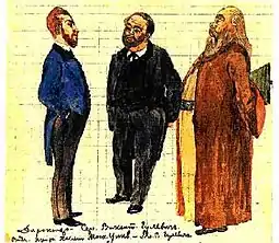 На некоторое время Н. Морозов стал завсегдатаем «Пенат» (всего Репин исполнил четыре его портрета)[121], где шлиссельбуржец впервые в жизни встал на лыжи и познакомился с К. Чуковским и Л. Андреевым[122]. При встрече с Брюсовым оказалось, что тот ещё с детства помнил Николая Александровича, который, будучи нелегалом, некоторое время жил в их доме[123]. Из литературных знакомств особо ценил Морозов своё краткое общение со Львом Толстым. 31 марта 1907 года он отправил в Ясную Поляну две своих книги и получил ответ уже в апреле: живой классик сожалел, что отсутствует продолжение мемуаров «В начале жизни». Однако личное знакомство состоялось только 28 сентября 1908 года по личному приглашению Толстого. Разговор касался книги Морозова «Откровение в грозе и буре» (которую Толстой так и не прочитал) и перешёл на обсуждение науки вообще[124][Прим. 7]. В конце беседы Лев Николаевич немало шокировал Николая Александровича тем, что позавидовал вслух его заключению. Этот случай быстро стал анекдотическим; его обыграл, в частности, В. Розанов в «Опавших листьях»: