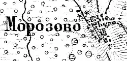 МОРОЗОВО — деревня Ведомства государственного имущества, по просёлочной дороге, число дворов — 78, число душ — 163 м. п.[6] (1856 год)