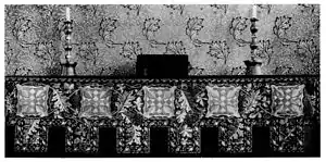 - «The work is carried out with floss silk in bright colours and gold thread, both background and pattern being embroidered. The five crosses, that are placed at regular intervals between the vine leaves, are couched in gold passing upon a silvery silk ground.» Christie, Grace (Mrs. Archibald H.): Embroidery and Tapestry Weaving, London, John Hogg, 1912; e-text at Project Gutenberg; notes to Plate XIII.