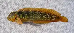 Длина тела до 11—13 см[3]. Самцы обычно крупнее самок. Тело голое, веретенообразное, покрыто слоем густой слизи. Надглазничные выступы короткие и практически незаметные. Окраска самцов более яркая, чем самок. В целом окраска сверху тела желто-зеленоватая, с 6—7 вертикальными полосами синеватого цвета и светло-голубыми точками на боках и линиями сверху. За глазом находится черноватое пятно, которое окружено синеватым ободком и кольцом такого же цвета. Гребень на голове желтоватого цвета, с поперечной тёмно-зелёной полоской. Спинной и анальный плавник зеленоватого цвета, с более светлой, буроватой или голубоватой каймой.