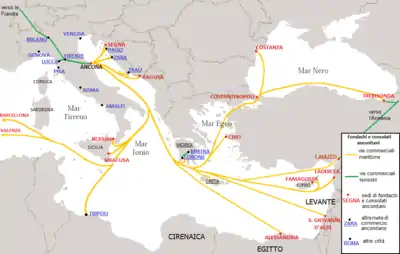 Крестовые походы предоставили возможности для экспансии. Они во все возрастающей степени полагались на итальянский морской транспорт, за который республики получали концессии на колонии, а также оплату наличными. Венеция, Амальфи, Анкона,[3] и Дубровник были и до этого вовлечены в торговлю с Левантом, но с Крестовыми походами эта торговля значительно выросла: тысячи итальянцев из морских республик стекались в Восточное Средиземноморье и Чёрное море, создавая базы, порты и коммерческие поселения, известные как «колонии». Это были маленькие огороженные анклавы внутри города, часто просто одна улица, где управление происходило по законам итальянского города губернатором, назначенным из родного города, со своей церковью и магазинами с едой в итальянском вкусе. Эти итальянские торговые центры также оказывали существенное политическое влияние на местах: итальянские купцы организовывали сходные с гильдиями ассоциации, стремясь приобрести юридические, налоговые и таможенные привилегии от местных правительств. Возникли некоторые личные владения. Пера в Константинополе, вначале генуэзскиий, впоследствии (под османами) венецианский, был крупнейшей и наиболее известной итальянской торговой базой.